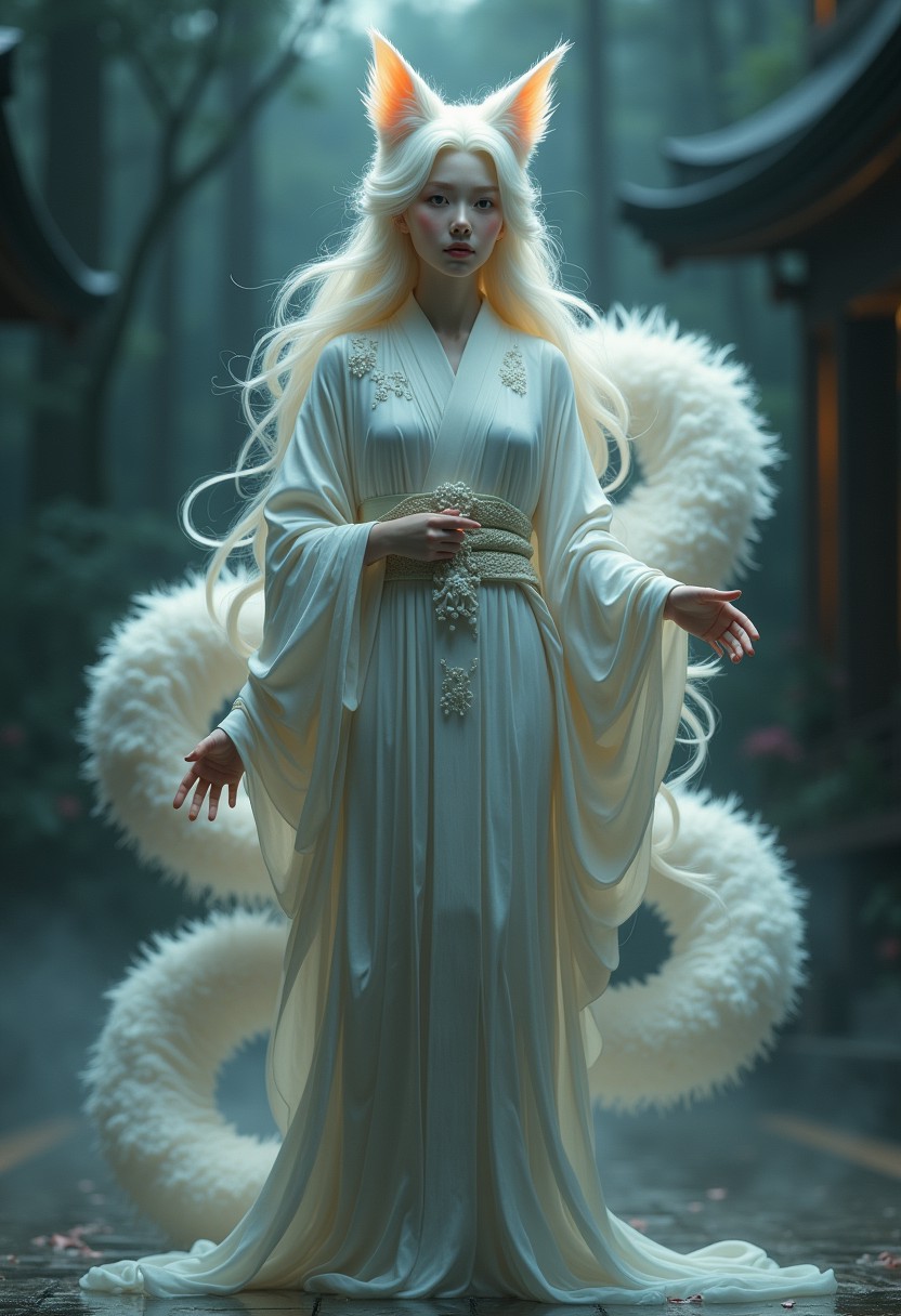 In the style of Michelangelo, the Kitsune—a Japanese yokai—appears as the most beautiful woman in the world, blending ethereal grace with a haunting, phantom-like presence. Her full-body portrait captures her divine beauty and supernatural essence. She stands with regal poise, her delicate features sculpted with classical perfection, while her long, flowing hair frames her face in soft waves. Her eyes glow with an enigmatic light, and every detail of her form is rendered with meticulous care. Her attire combines traditional Japanese elegance with divine drapery, shimmering as if touched by a ghostly breeze. Intricate patterns of foxes and swirling clouds adorn her robes, hinting at her true Kitsune nature. Behind her, nine ethereal tails fan out, blending into the misty, spectral atmosphere. The background is a shadowy landscape where the physical and spiritual worlds blur—perhaps a moonlit forest or temple courtyard. Soft, phantom-like light enhances her spectral presence. The scene exudes serene, haunting beauty, capturing the Kitsune's divine and phantom aspects in a portrait that is both breathtaking and mysterious.