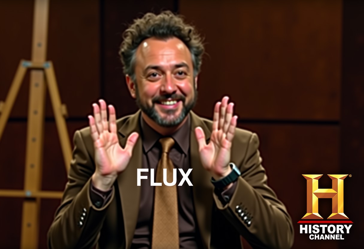 Giorgio A. Tsoukalos aliens meme. he has brown curly hair worn up against a receding hairline, wearing a brown suit, brown shirt, and brown tie. he is seated, looking off-camera to the left, holding his hands vertically with his palms facing each other as if he was measuring distance. he grins slightly. the camera is focused on his shoulders and face. the word "FLUX" is printed at the center of the screen. the background of the image is bokeh focused wooden paneling with an easel. In the bottom right corner, a roman style golden H is seen, as this is on the History channel.