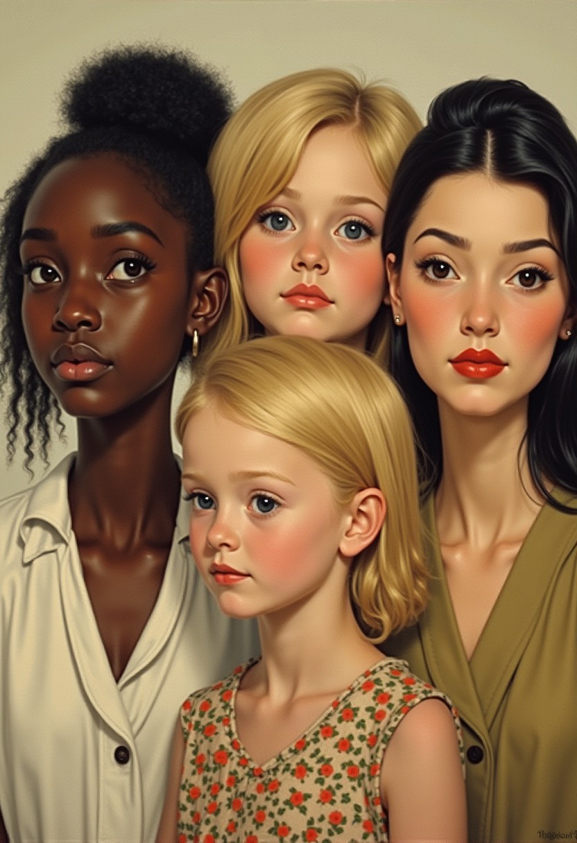 painting of a group of young African, Japanese and blonde people by William Adolphe Bouguereau, and Norman Rockwell