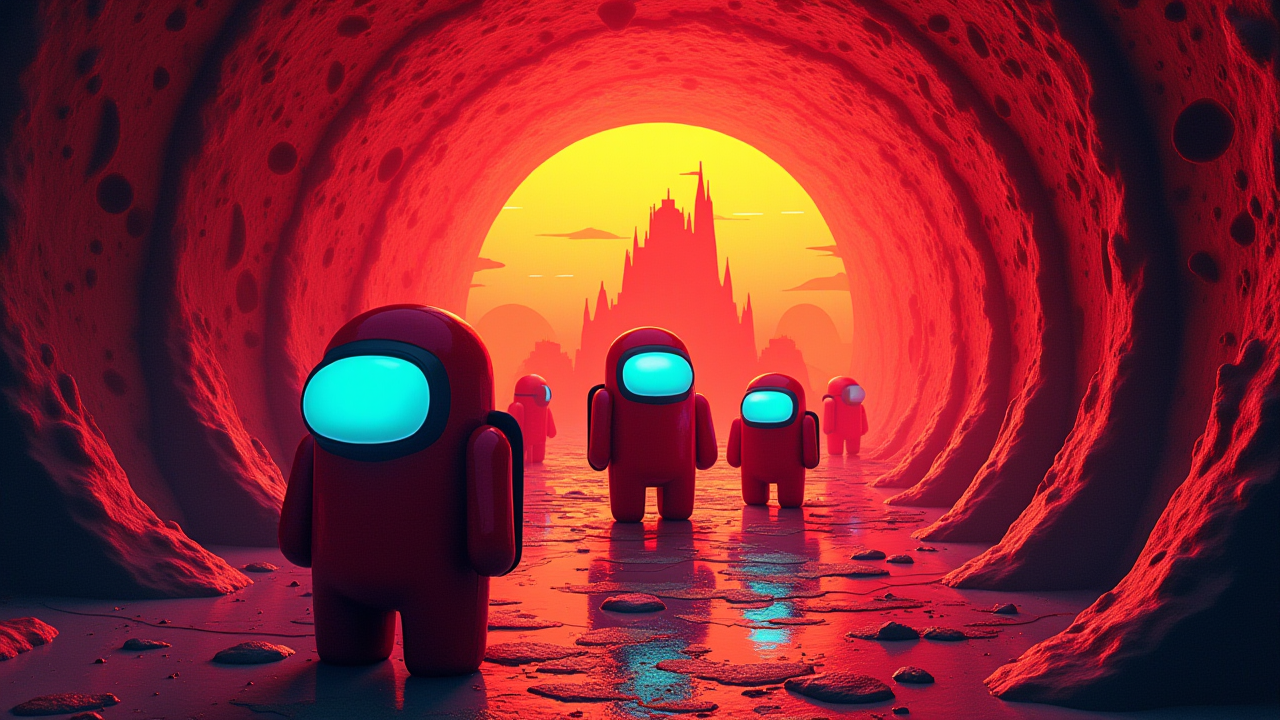 A Pulsating poster featuring the crew from Among Us in an electric red 1960s art style, with DayGlo orange, The Wizard backgrounds and Desolate images, as they try to navigate through a Accomplished, trippy spaceship. With Text:"Among Us x dark indigo 60s"