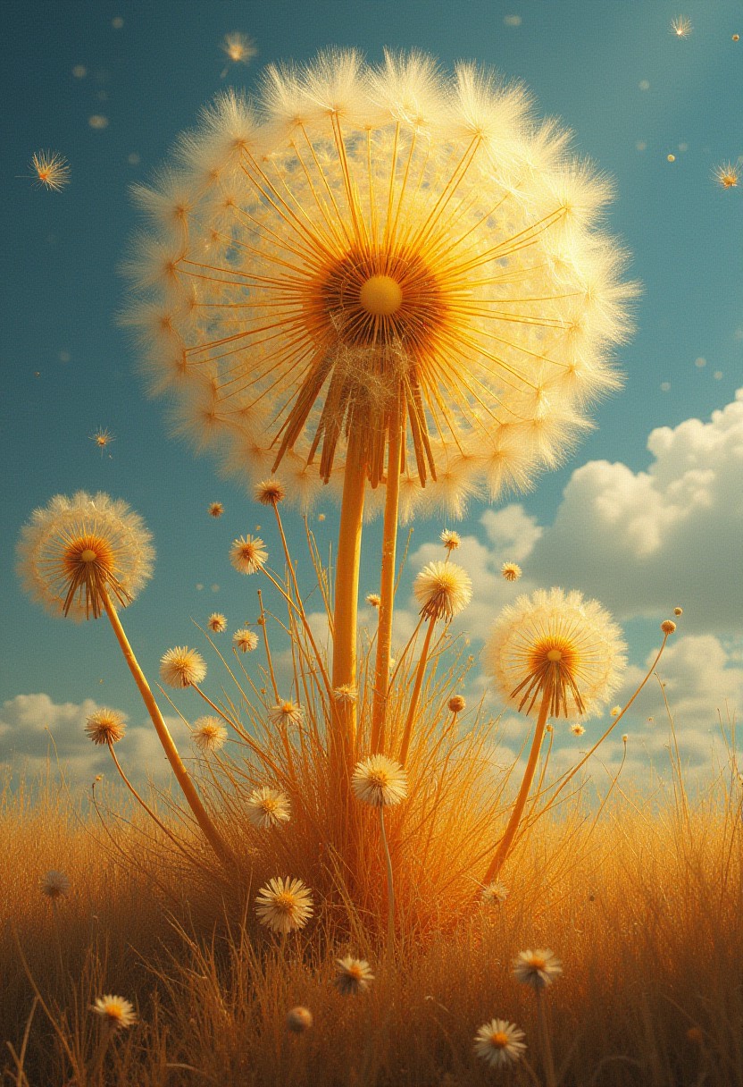 rule of third, transparent blows dandelions sculpture made of transparent gold, descending towards earth from a dreamy sky, absurd world in style ink, acrylic and water color, Klimt and jeremy mann style detailed matte painting, deep color, fantastical, intricate detail, splash screen, complementary colors, fantasy concept art, 8k resolution trending on Artstation Unreal Engine 5, low-key, detailed, 8k, semi-raalistic,
