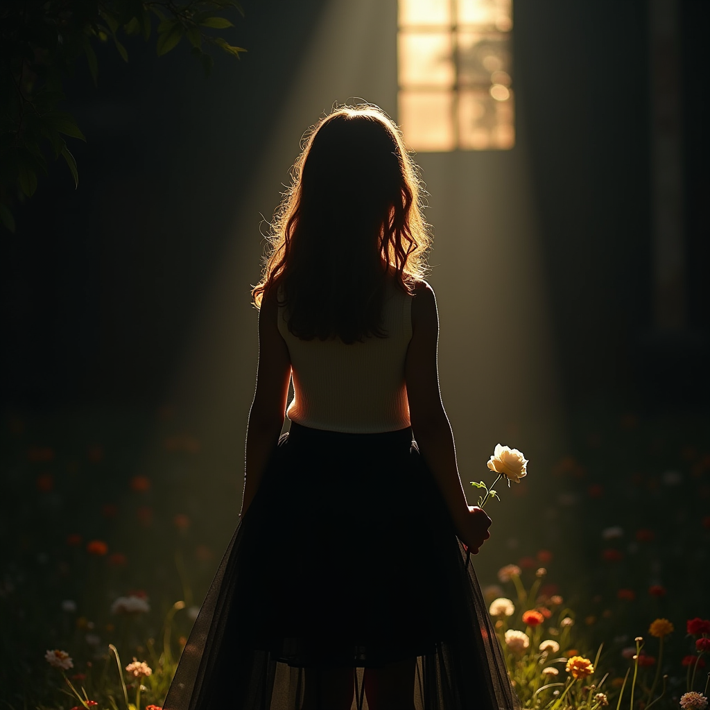 In the night, a girl with her back to the camera, dressed in black chiffon skirt, holding a white rose in hand, faces the church. A beam of light from the window of the church shines on the girl, illuminating her through the black chiffon, casting a golden halo around her silhouette, while wilting flowers are at her feet.