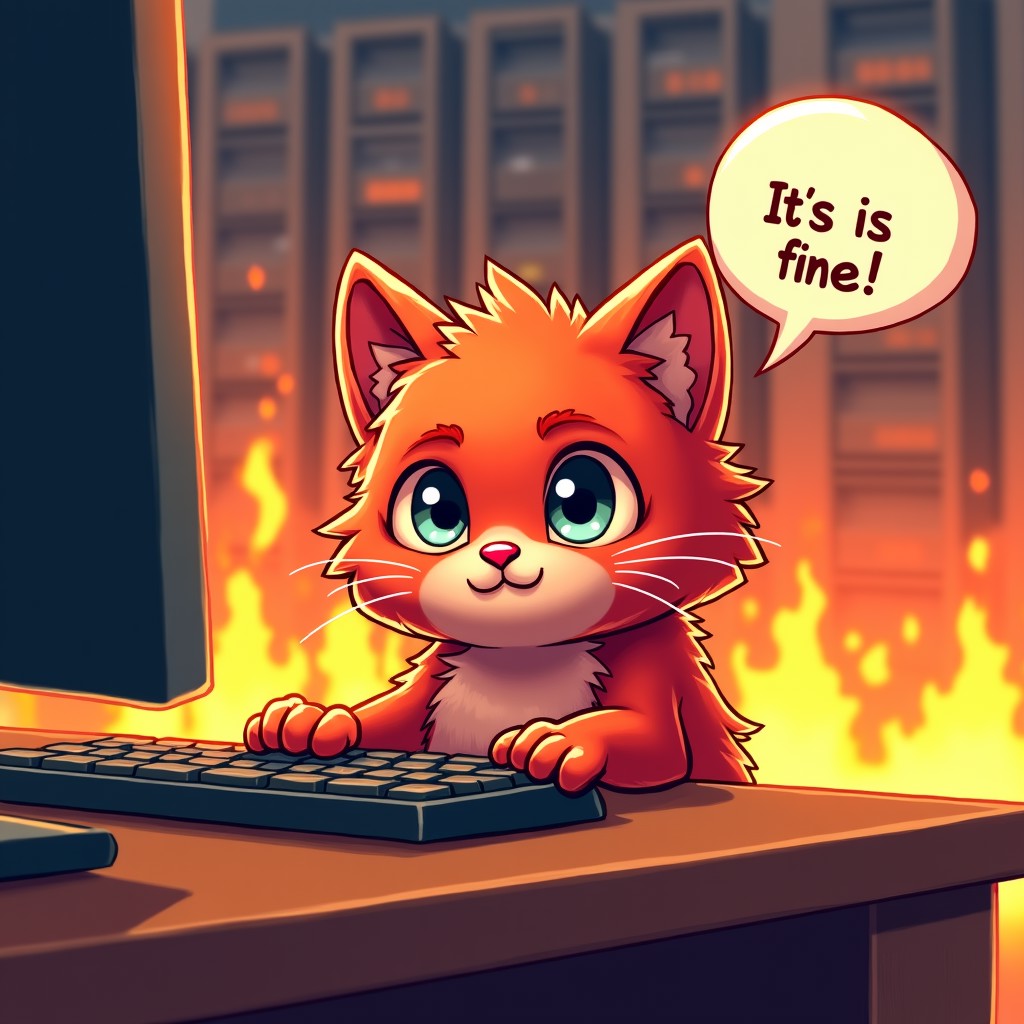 cute fluffy disheveled red kitten is sitting at the table at the computer and types on the keyboard, looking at the viewer, big cute eyes, everything around is on fire, (((speech buble above his head with text "This is fine"))), server room on fire, computer lab, smoke, detailed, depth of field, detailed background, cartoon grafic