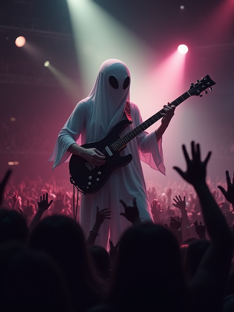 ghostlora, ghost, electric_guitar, playing_instrument, on stage, bright lights, performing, audience, crowd, cheering