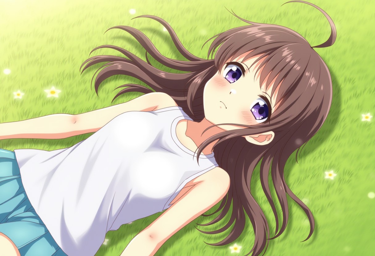 an anime girl lying on grass, wearing sleeveless shirt