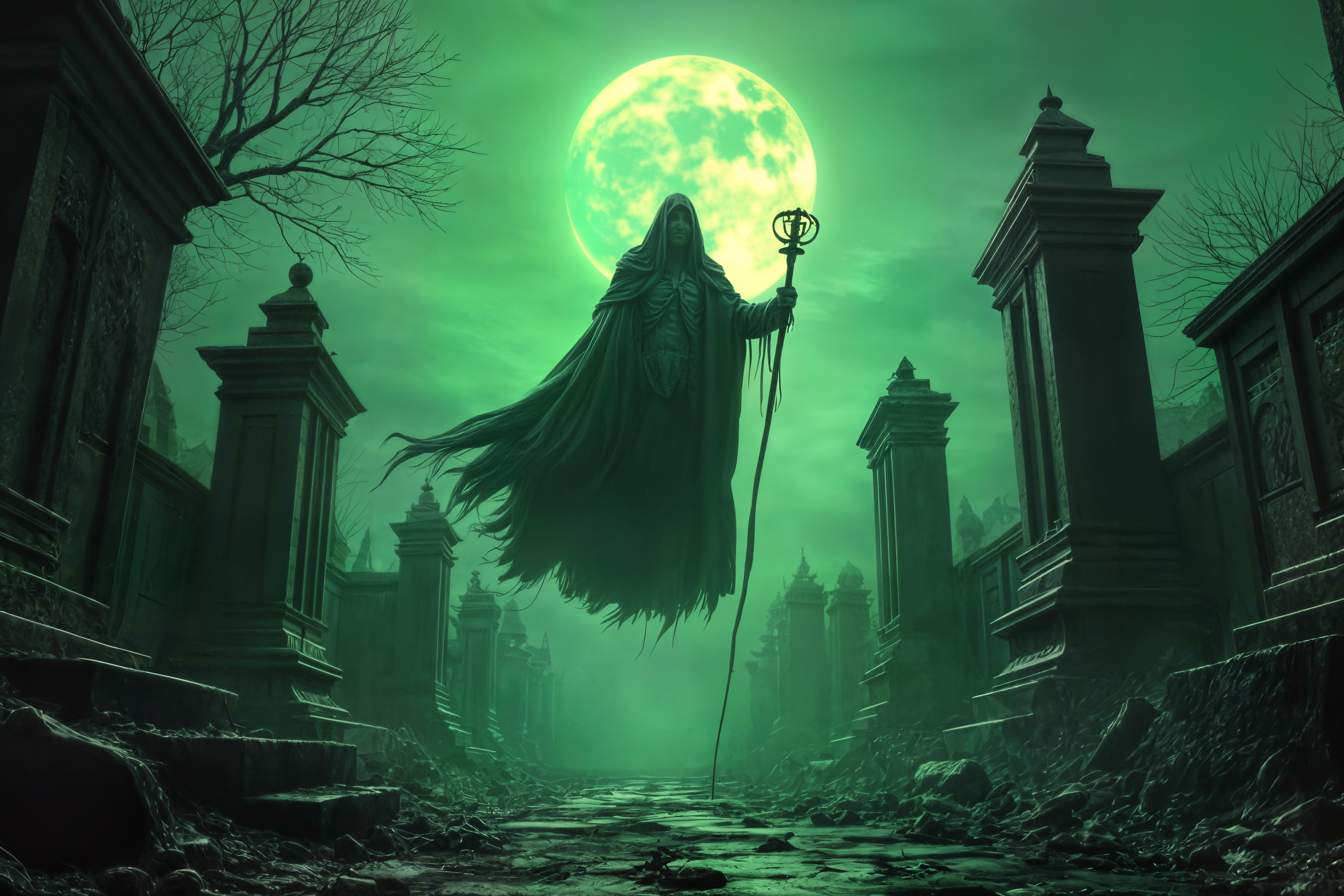 A decaying necropolis under a sickly green moon. Statues of long-forgotten kings loom, their hollow eyes vacant. Rusted chains dangle from shattered mausoleums, revealing hidden catacombs. Faded sigils pulse faintly in the eerie fog. A spectral lich floats above the cracked earth. His tattered robes flow around a skeletal form of boundless malice. Cold, soulless eyes peer into the void. Jagged teeth gnash silently. Thin fingers, tipped with brittle claws, clutch a staff made from twisted bone. His shadowy aura distorts reality. Ominous chants fill the air. Withered vines coil around shattered crypts.