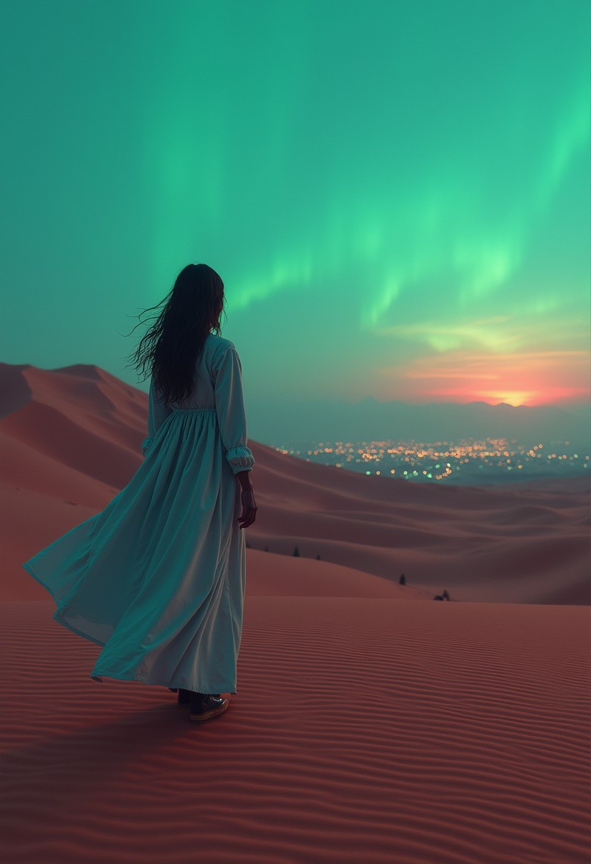 Digital Wanderer, Azure Dusk: Vaporwave aesthetic, flowing digital robes, lone figure amidst rust-colored dunes, distant city shimmering with emerald lights, melancholic synthwave soundtrack.