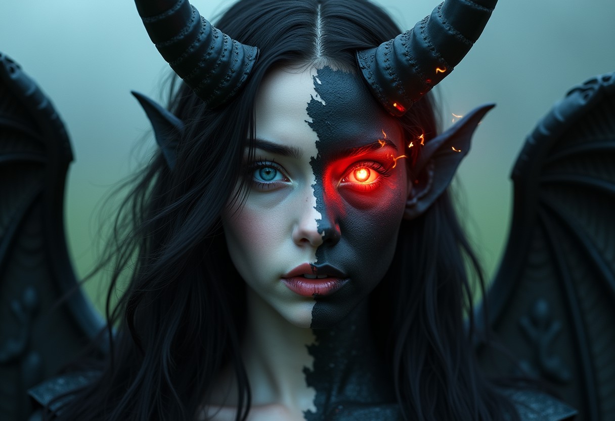 Misty Valley, a close-up of a mysterious fealem entity, one half of her body and face is beautiful, angelic appearance, blue eyes, black hair, the other half of her body and face is demonic, coal-black skin, red eye and hair are burning with fire, demonic horn, on her back are wings corresponding to each part of the body. Dark atmosphere, cinematic, masterpiece, clear focus.