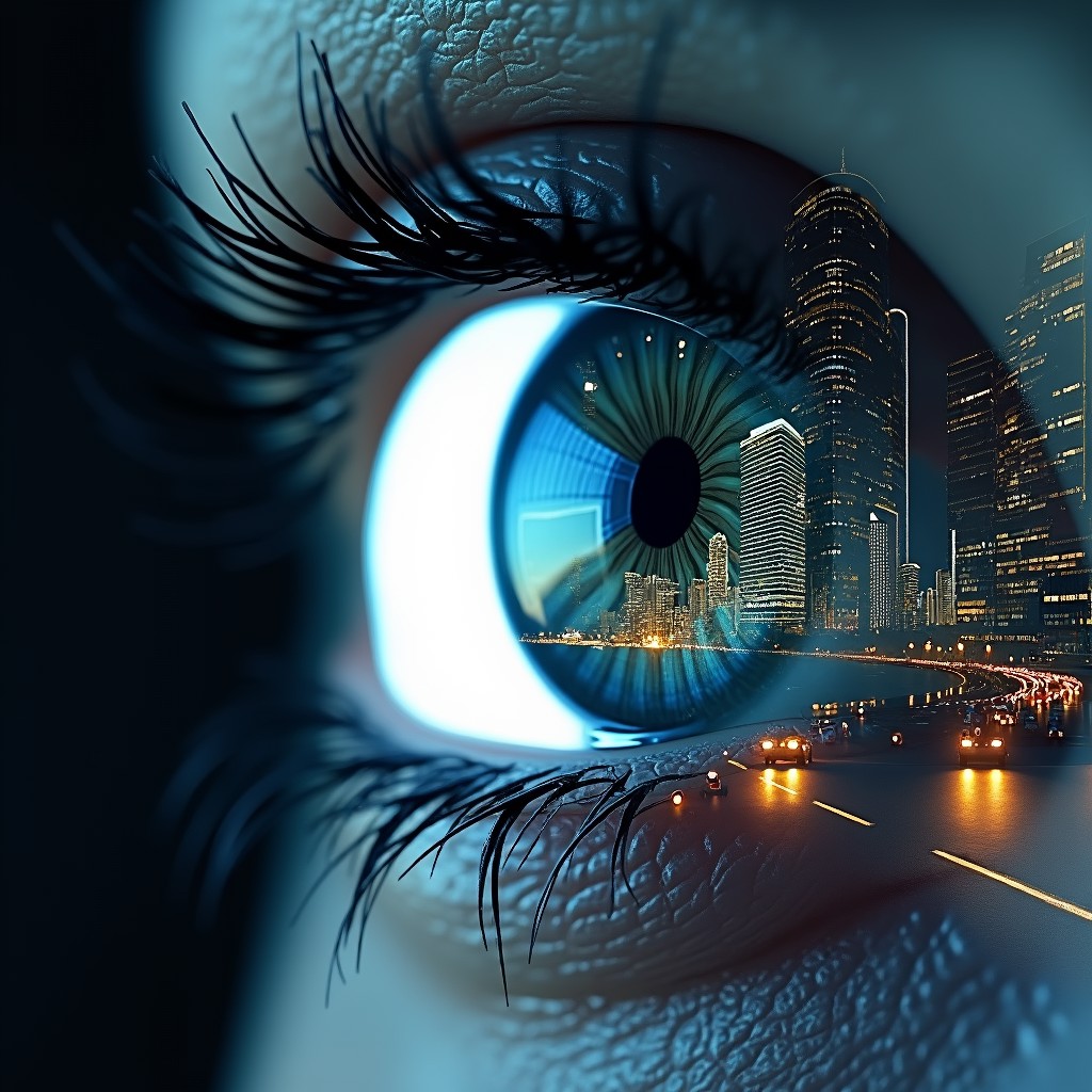 stunning image of a woman's eye, fused with an abstract, vibrant city silhouette at night, with city lights sparkling on high-rise skyscrapers and bustling streets; iris dilated. The eye is surrounded by a strong white void that creates a striking contrast and adds depth and intensity to the overall picture, hyperrealistic, digital, structured, surreal, gloomy and mysterious.