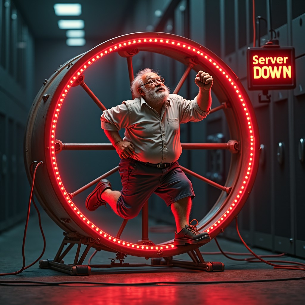 a poster ad of a very old man running on a large hamster wheel, wires connected to a large hamster wheel from a server, red light warning signalling low power, low power led indicator, old man sweating and tired, word printed on the led board saying "Server Down"