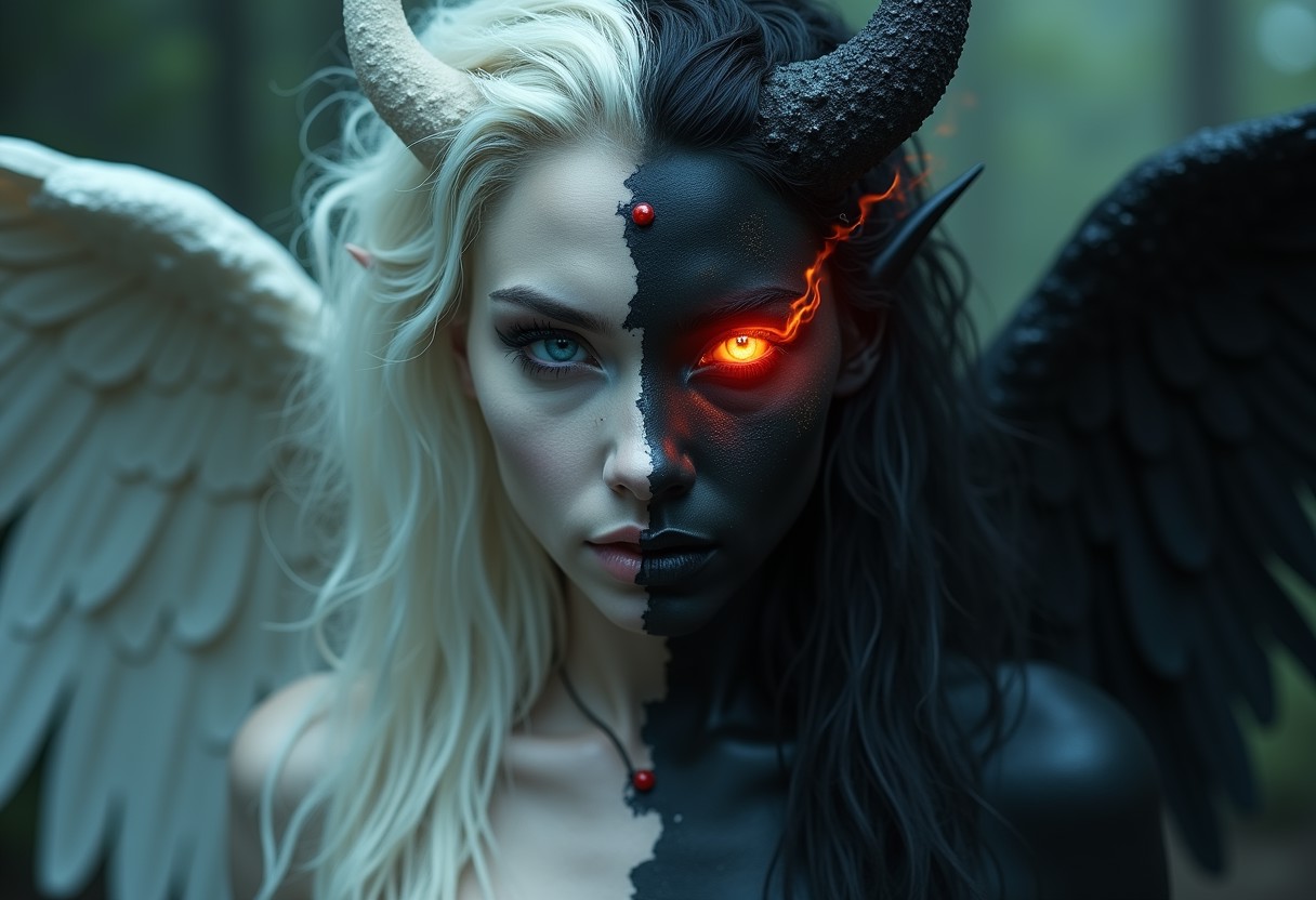Misty Valley, a close-up of a mysterious female entity, one half of her body and face is beautiful, angelic appearance, blue eyes, white hair, the other half of her body and face is demonic, coal-black skin, red eye and hair are burning with fire, demonic horn, on her back are wings corresponding to each part of the body. Dark atmosphere, cinematic, masterpiece, clear focus.