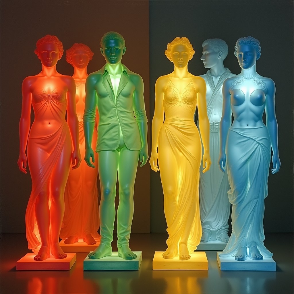 Painting of translucent sculptures of men and woman with a light inside by William Adolphe Bouguereau and Ivan Pokidyshev, (red and green sculptures of people on the left, blue and yellow sculptures of people on the right:0.7) (Painting men and woman with sculptures of men and woman, (people with sculptures, dress, shirt, pants, robes, colorful background:1.6)
