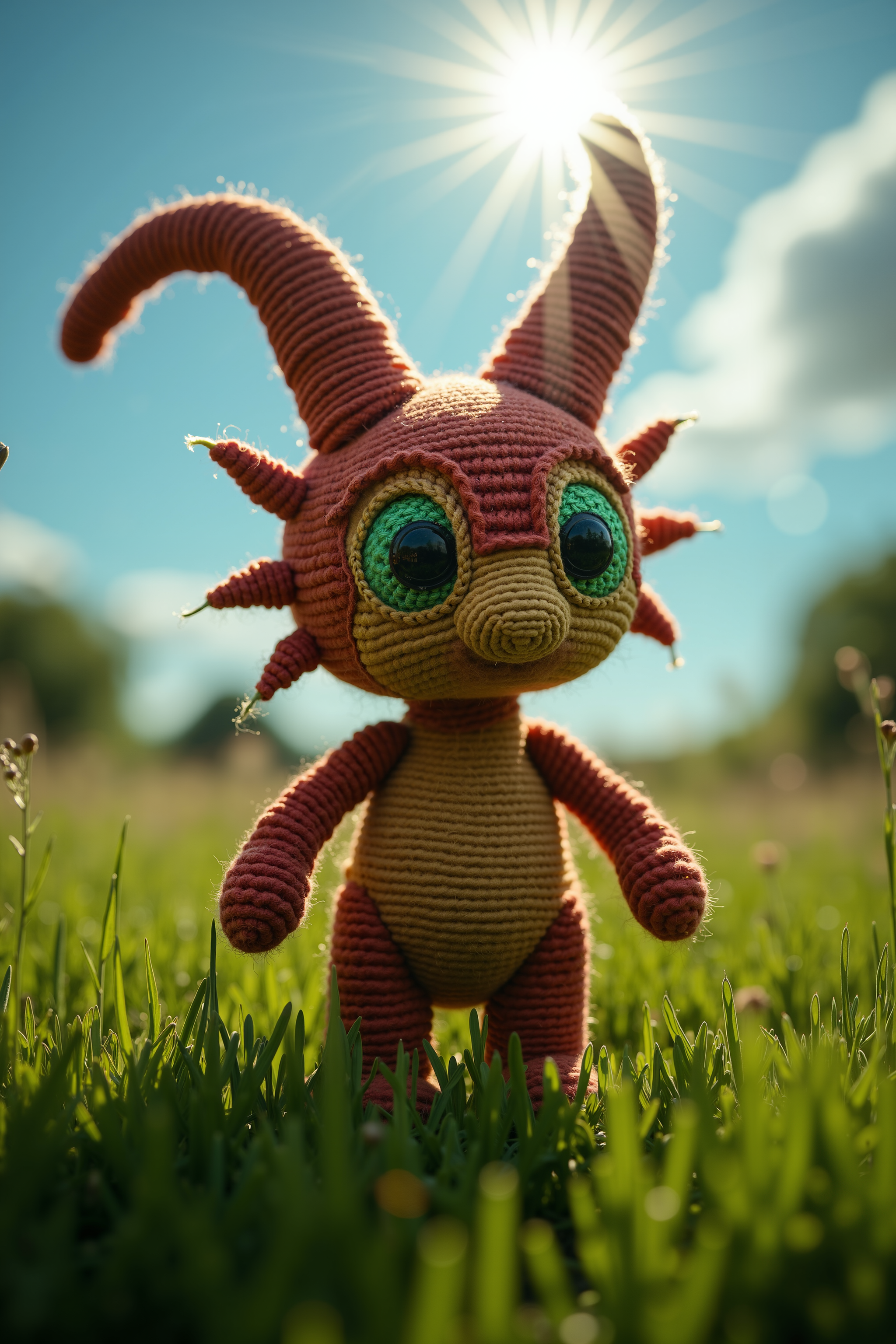 In a whimsical world where mathas, Fiend seeker is depicted as an intricately designed toy, crafted entirely out of yarn. The scene takes place in a field of green grass, with the sun shining brightly overhead.