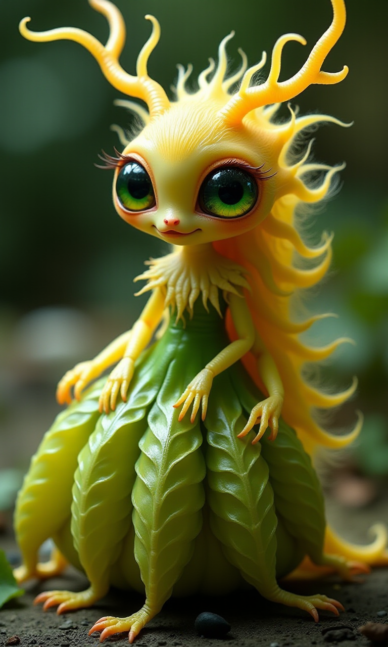 A vibrant alien creature, a human-like caterpillar, antennae with eyes, soft and transparent skin, a gorgeous evening dress made of leaves, long shiny hair, four arms, gorgeous dress, exquisite details, Yellow-green tone