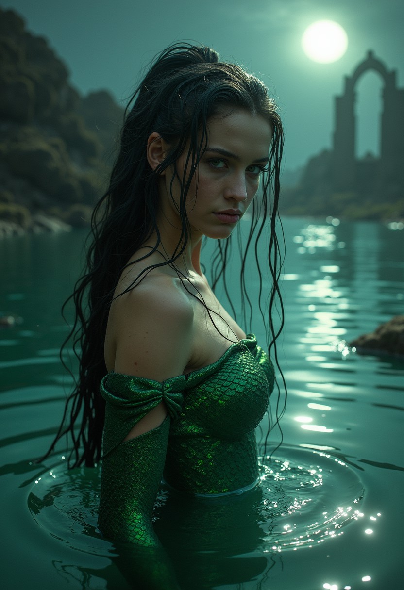 A bewitching mermaid queen with shimmering emerald scales, her long, wet hair cascading down her back as she emerges from the dark waters of an enchanted lagoon. The moonlight reflects off the water and her scales, creating an ethereal glow around her. She gazes seductively towards the shore, where ancient ruins are barely visible through the mist.