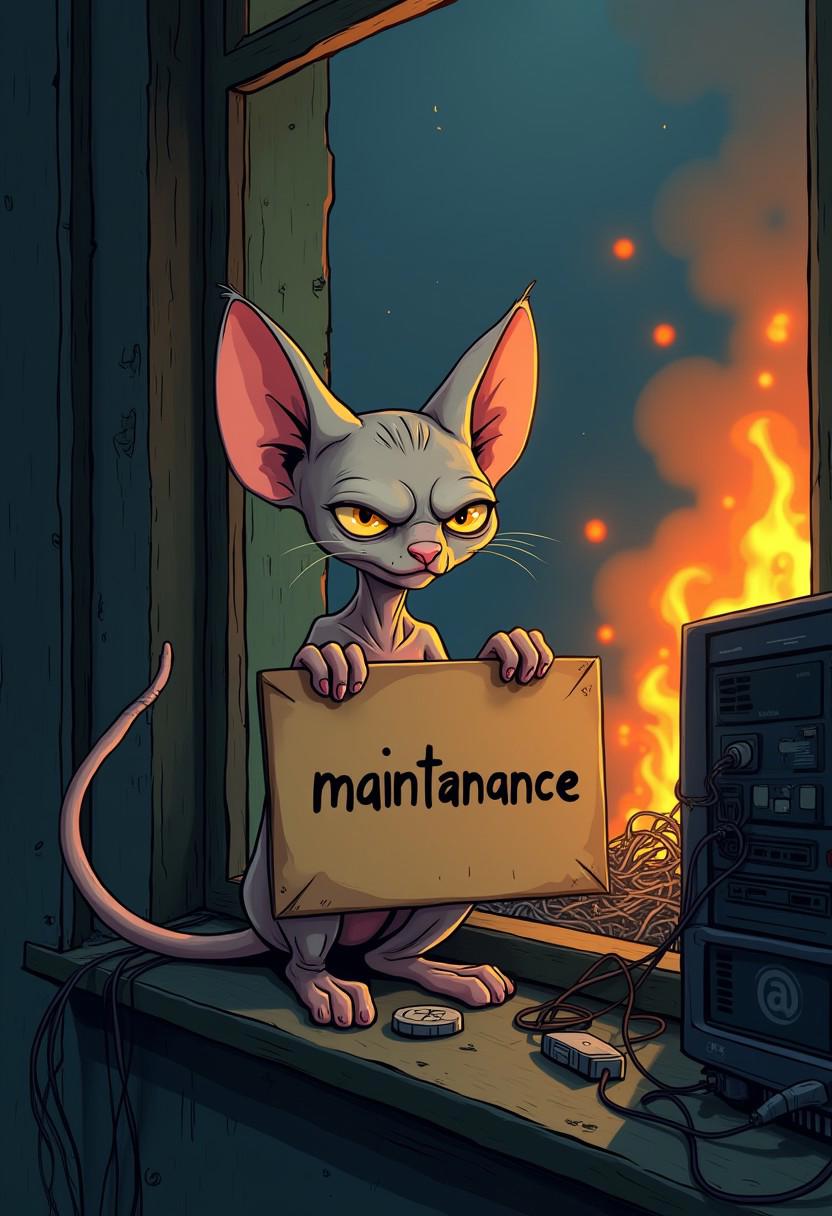 (masterpiece, best quality:1.5), ghibli style, whimsical and enchanting image in a cartoon style reminiscent of Studio Ghibli, ghibli and Tim Burton collaboration, source_cartoon, 8k, art, high-resolution illustration, a mean-looking skinny hairless cat holding a sign with text "maintenance", text is in quotations, her skin is wrinkled and taut, sinister narrow-eyed expression, perched on a windowsill with soft dim light illuminating her, in the background there are computers on fire, server room with ripped cables, messy chaotic hardware, sparks and smoke, cables on fire, very detailed anime art, read description, Expressiveh, all drawn with a soft hand-painted look, style is characterized by clean lines, soft gradients, and a harmonious blend of colors, extremely detailed