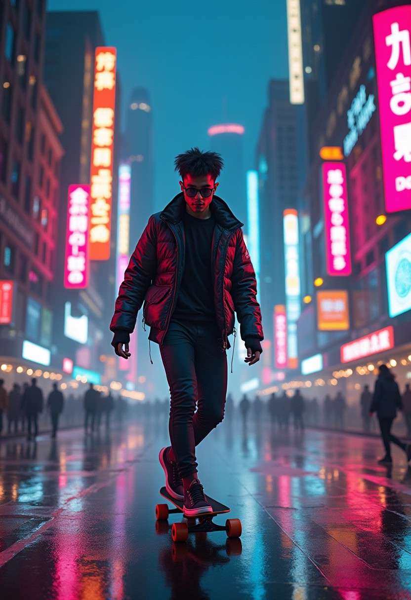 a cyberpunk skater navigating the futuristic streets of New York City in 2050. The skater is young, with a Latin appearance and wears cool glasses. Neon-lit cityscape and fast-paced movement through the bustling environment, resembling a movie intro.