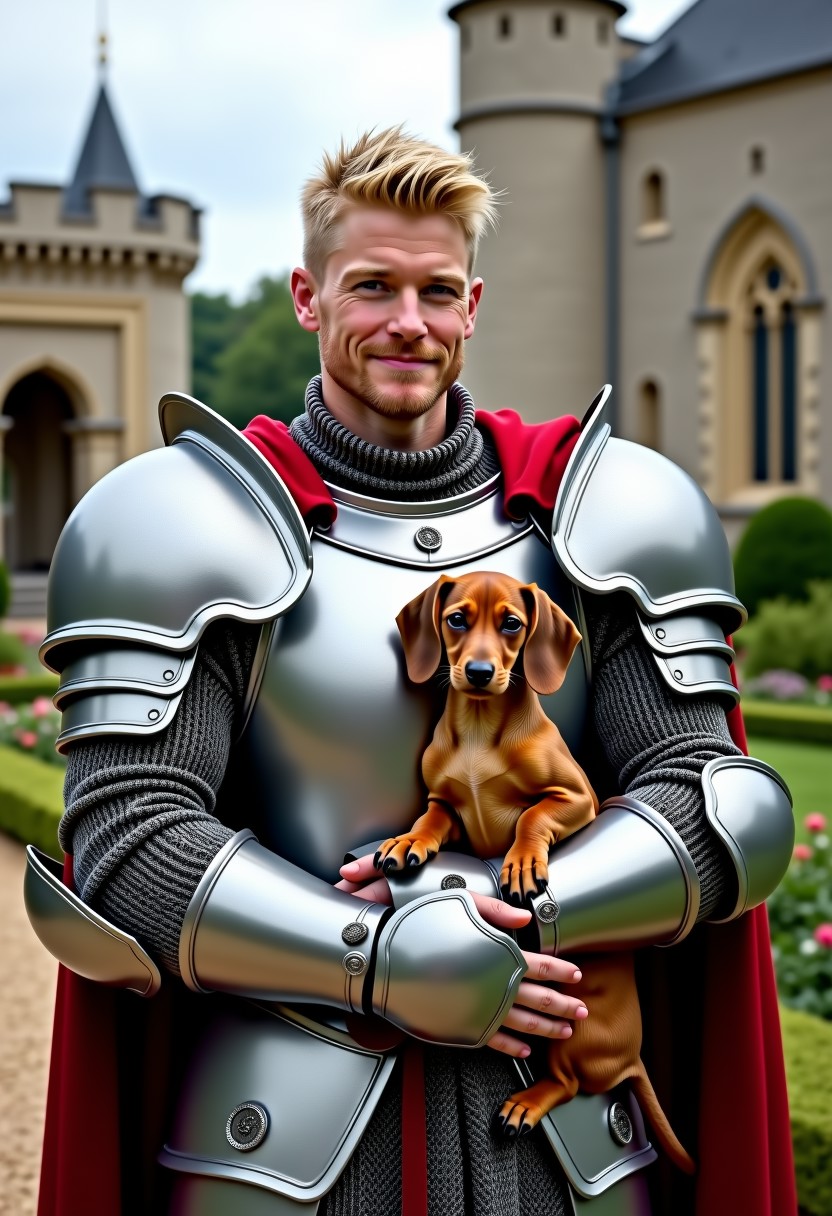 Beautiful muscular blonde man in full armor, slight smile, dragon-head pauldron, dragon-patterned armor, silver armor, chainmail joints, holding the cutest dachshund puppy, castle garden background