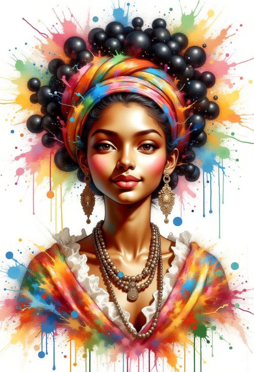 inkBaroque, portrait, 1woman, afro, dark skin, colorful hair, hippie clothing, beautiful smile, cartoon