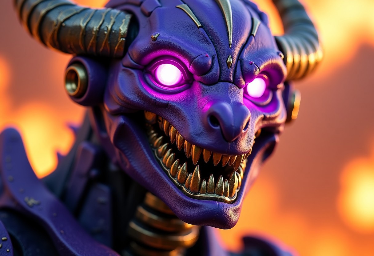 robot with intricately detailed glowing purple eyes, angry, purple-and-gold robot, draconic, background explosions