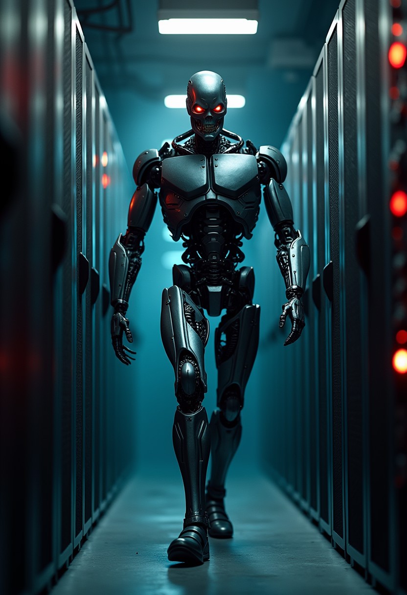 movie poster style, menacing robot walking though the server room, looking at the viewer, at the the bottom of the image the text "i'll be back" is written in bold, portrait, close-up, Detailed, masterpiece, professional, bold colors, awe inspiring, photography , 30mm shot, action scene, HDR, post apocalypse, terminator style,