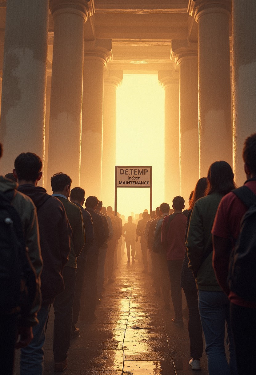 Score_9, score_8_up, score_7_up, queue of people impatiently waiting to get into heaven, pearly heaven gates, anger starting to erupt, sign on the gates saying maintenance, under maintenance focus, humour image,