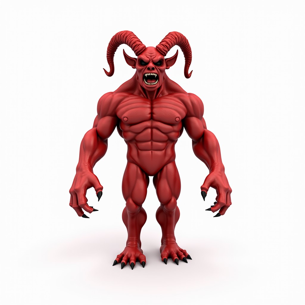 Red demon humanoid 3D video game model, arms down to sides, long horns. muscular, frightening, evil, white background, symmetrical pose