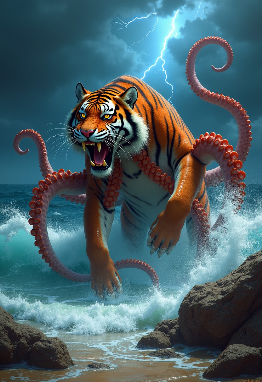 An awe-inspiring tiger-octopus hybrid emerging from the ocean onto a rocky shoreline under a stormy sky. This creature has the powerful, striped body of a tiger, but its limbs are replaced by massive, coiling octopus tentacles, each covered in suction cups that grip the wet rocks. The tiger’s face is fierce, with intense, glowing eyes and sharp teeth bared in a roar, while the tentacles move with a fluid, almost hypnotic grace. The sea churns violently behind it, waves crashing against the rocks, and the dark clouds overhead are lit by occasional flashes of lightning, casting an ominous, electric blue light over the scene. The image captures the raw power and primal energy of the hybrid, with a dramatic, dynamic composition reminiscent of the epic fantasy art of Frank Frazetta.
