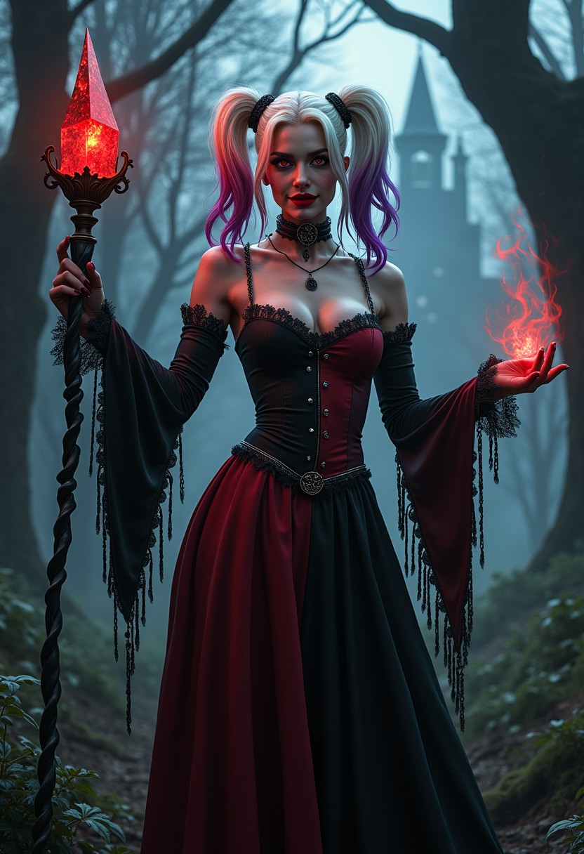 A dark, photorealistic portrait of Harley Quinn from the DC Universe reimagined as a gothic sorceress in a twisted fantasy world. Harley stands in a shadowy, enchanted forest, her expression playful yet sinister. Her usual jester outfit has been transformed into a dark, gothic gown with blood-red and black lace, adorned with arcane symbols and silver chains. Her hair, still in its iconic pigtails, is now streaked with blood-red and deep violet, the ends curling like dark magic. In one hand, she holds a twisted, black staff topped with a glowing, crimson crystal, pulsing with chaotic energy. Her other hand is engulfed in a swirling mass of dark magic, ready to unleash her powers. Her eyes glow with a mischievous, supernatural light, hinting at her unpredictable nature. The background features ancient, gnarled trees, dark mist, and the faint outline of an old, decrepit castle. The atmosphere is eerie and foreboding, capturing Harley Quinn’s chaotic energy and mischievousness in the guise of a powerful, gothic sorceress.