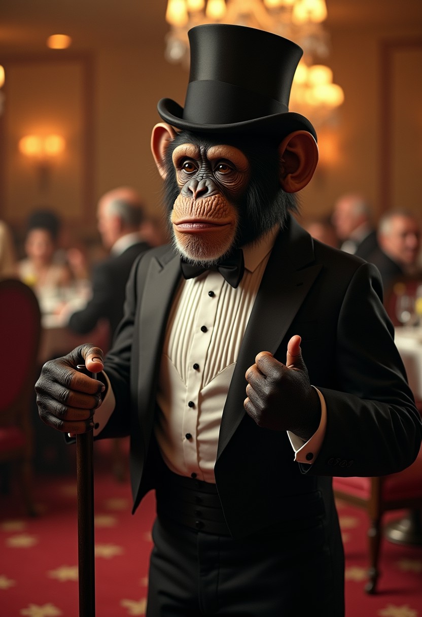 Chimpanzee, tuxedo, top hat, cane, dancing, dinner party, dining room, perfect hands,