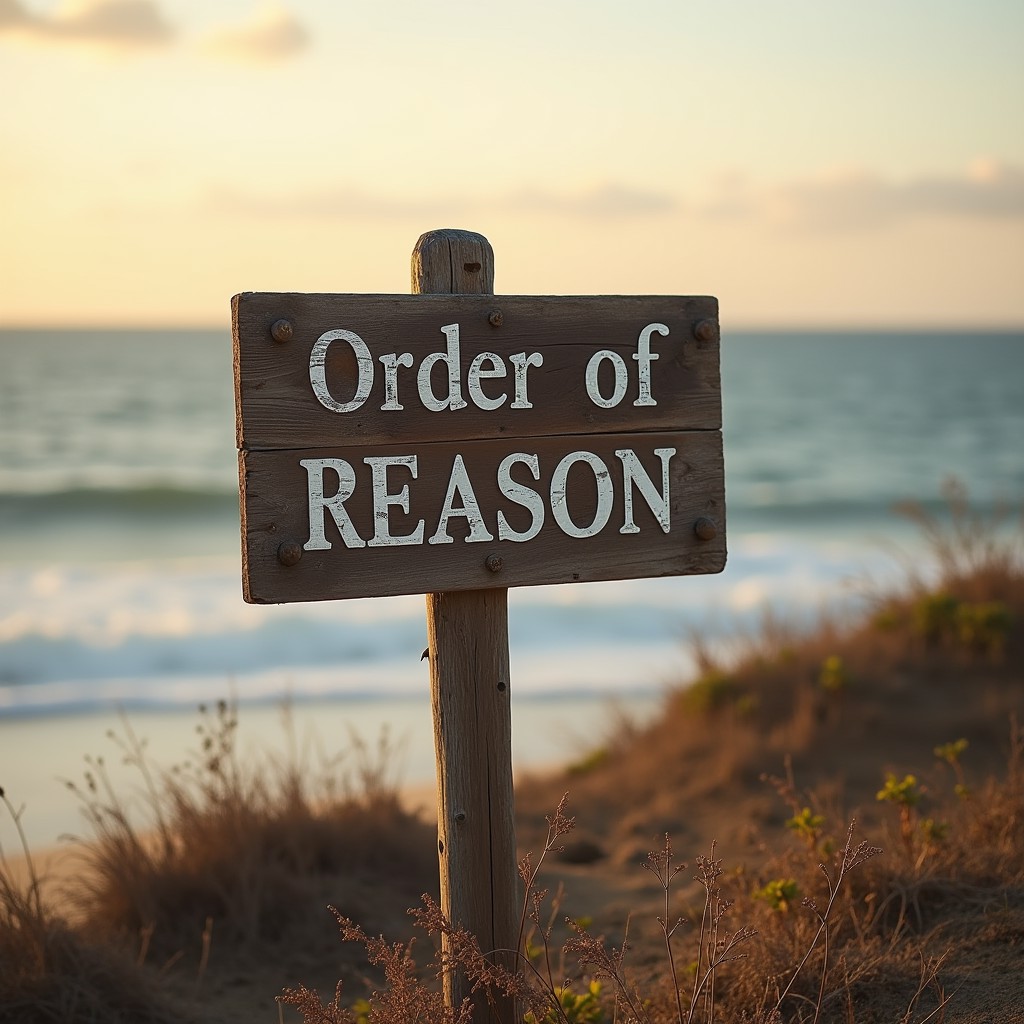 A simple wooden sign that says "Order of Reason") in front of an ocean. Warm colours. Atmospheric, rustic, pleasant daylight.