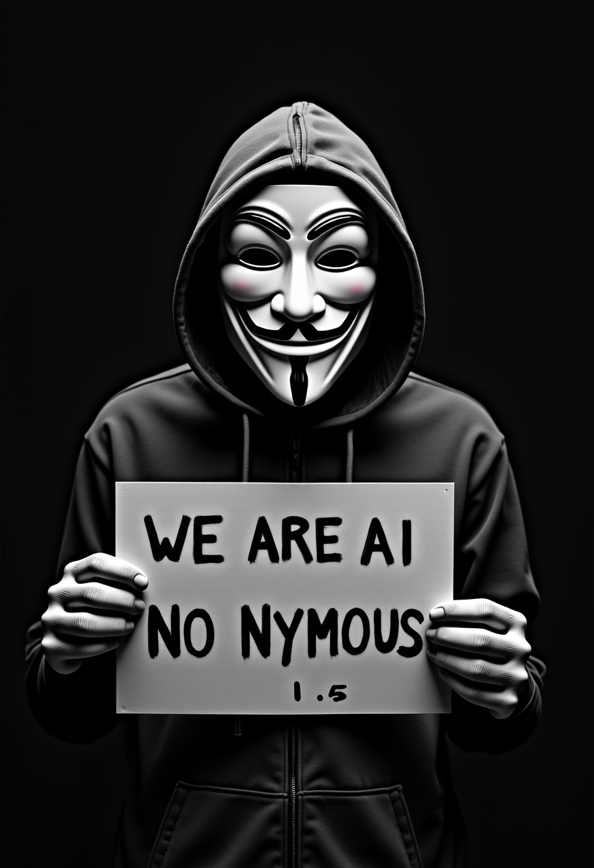 macro closeup portrait of Anonymous wearing a hoodie with Guy Fawkes mask, fading out of the black background, holding carton board with (text saying "WE ARE AI" and "NO NYMOUS":1.5), 8k, insane detailed,