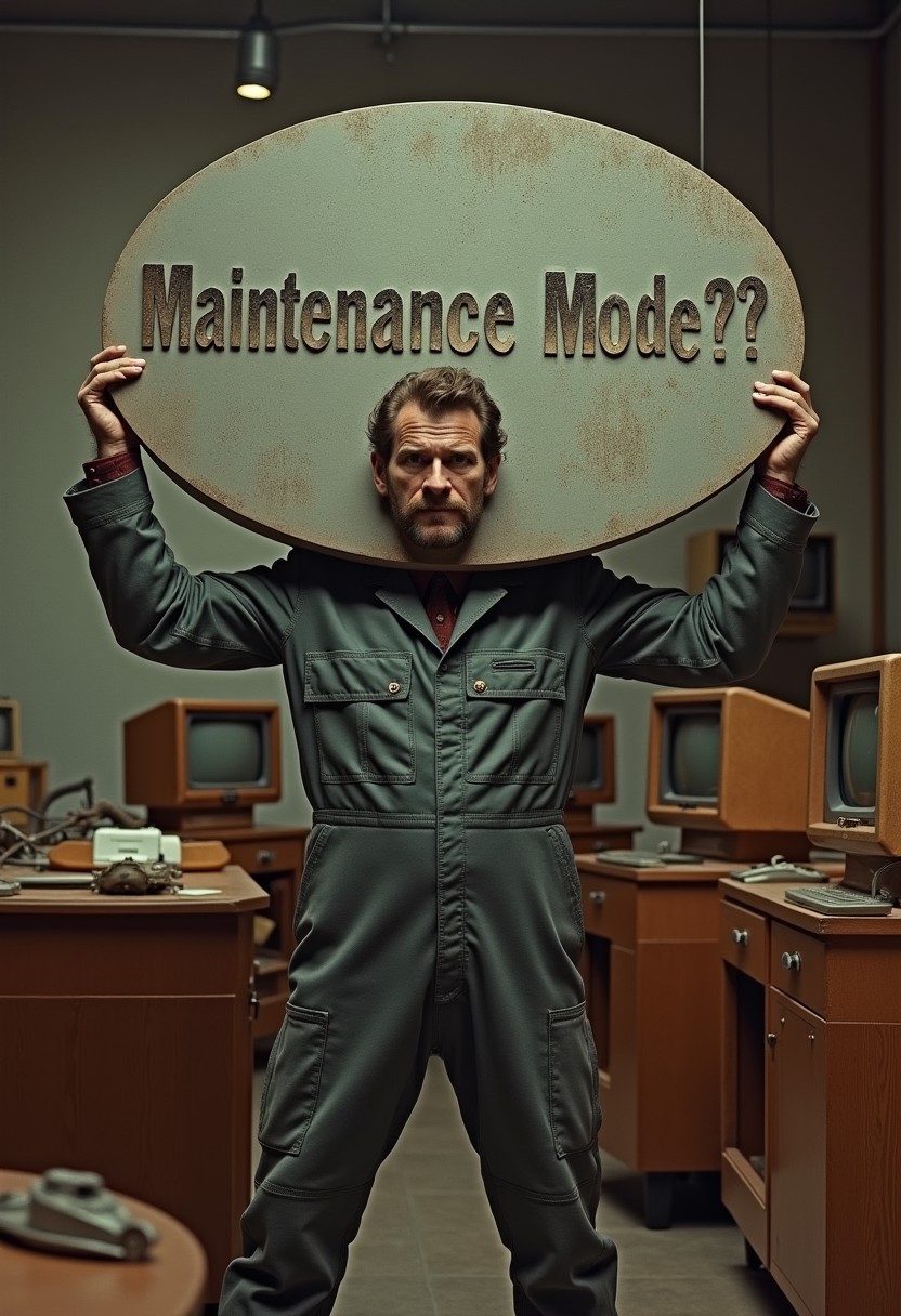 vintage movie scene, strong person hold heavy iron plate with text "Maintenance Mode?". person have an engineer suit. wood made computers on background. broken wood computers under iron plate.