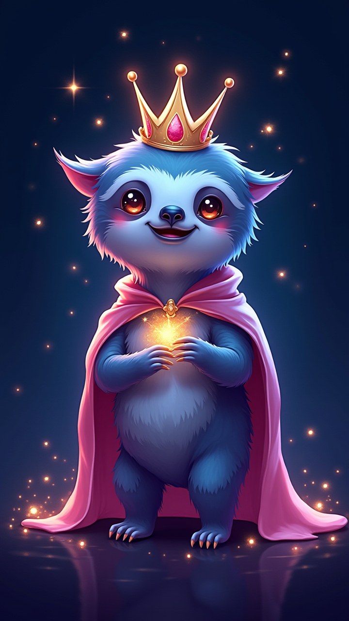A Luminescent sloth wearing a crown and a magical cape, surrounded by sparkles.