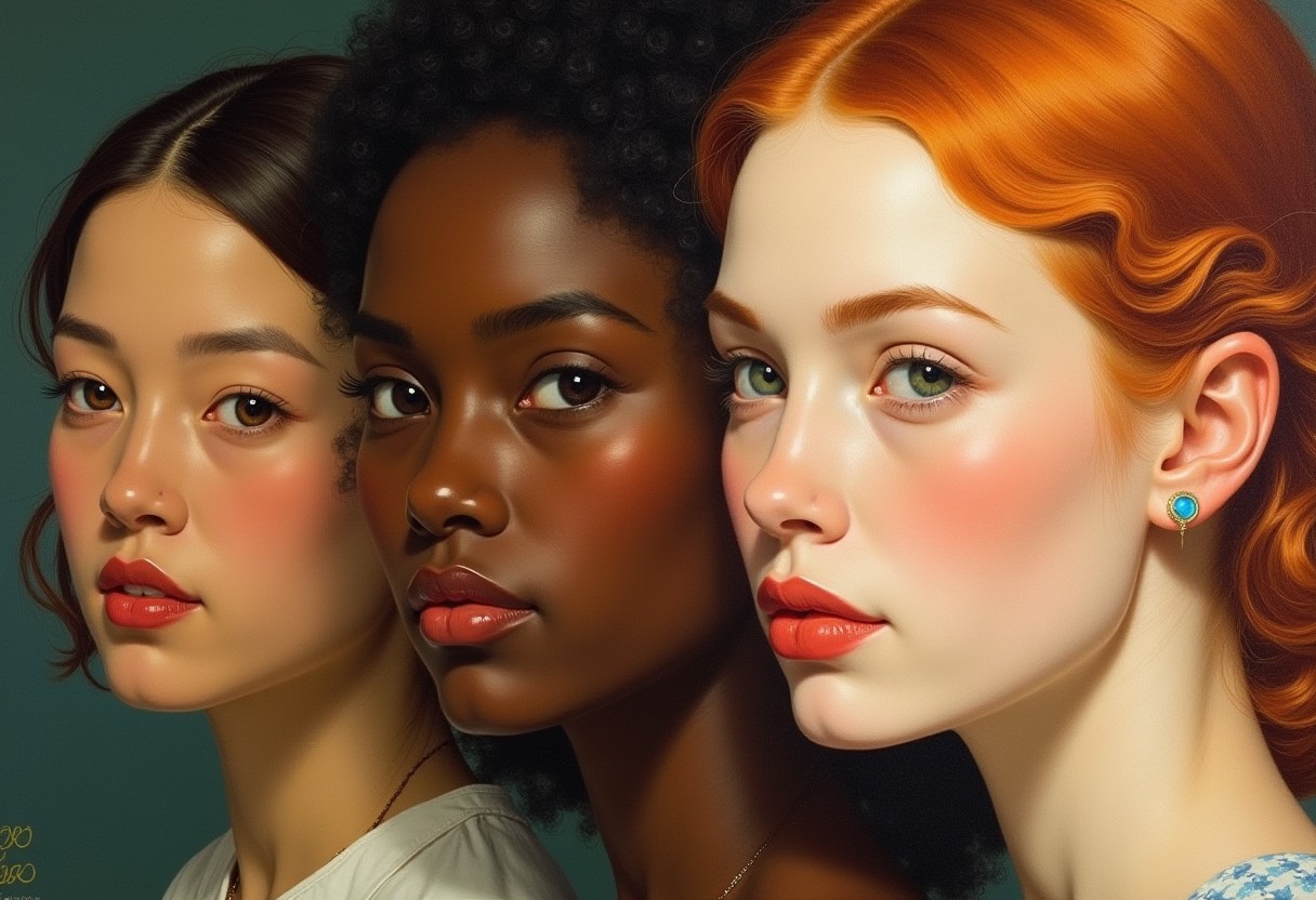 (painting of 4 people:1.3), black African woman with a asian woman from japan on the left, (chinese woman, japanese woman, asian woman:1.4), blonde woman with blue eyes with a red haired woman with green eyes on the right, (blonde woman with blue eyes, red haired woman with green eyes:1.2), painting by William Adolphe Bouguereau and Norman Rockwell