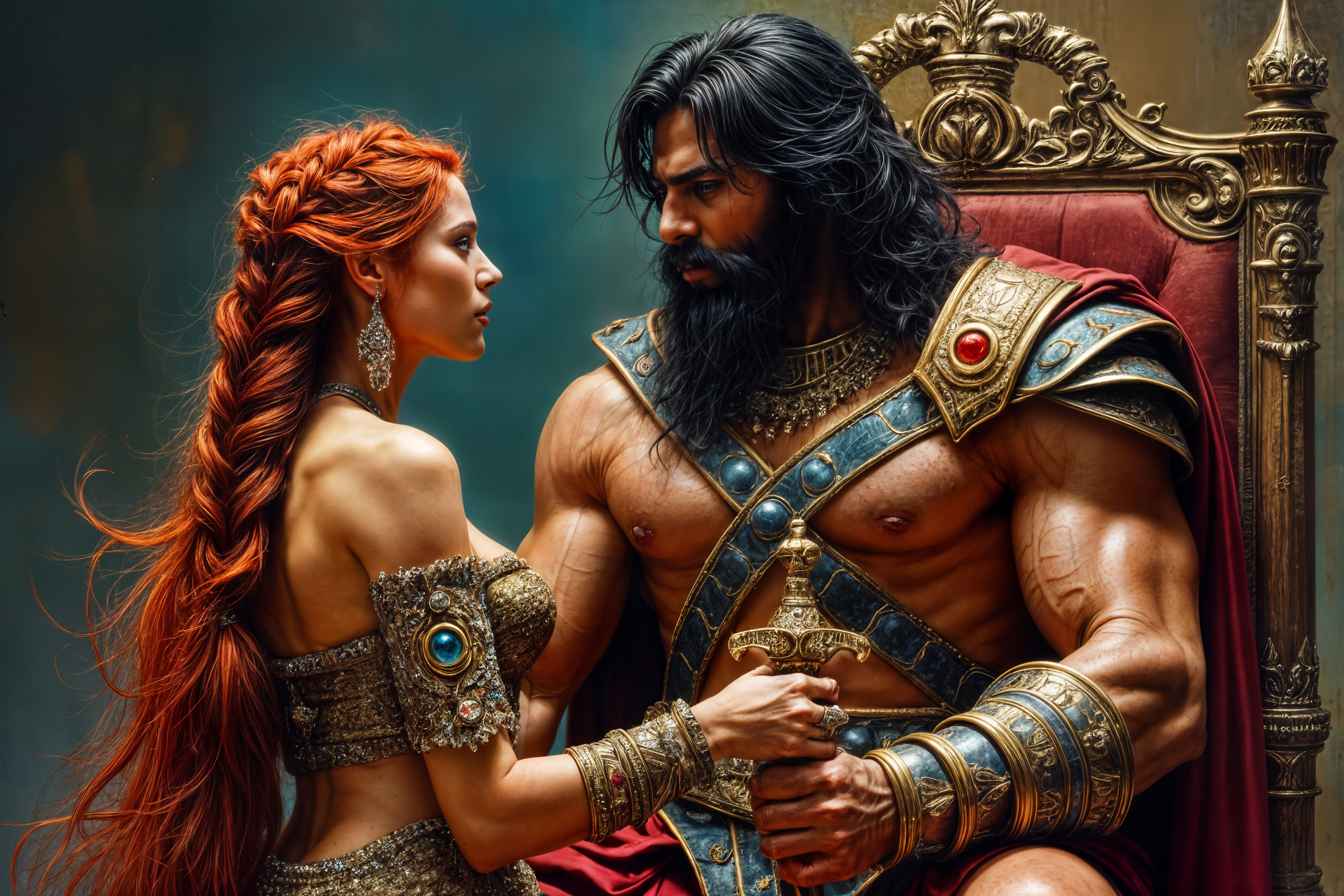 Dark fantasy oil painting of Lord Conan, emperor of the Waste, standing by his jewel-encrusted throne. He holds an ornate sword, showcasing his muscular build and striking features. Inspired by Boris Vallejo and Frank Frazetta, with dramatic shadows and depth. His consort with long red braided hair and jeweled dress armor gazes up at him with devotion