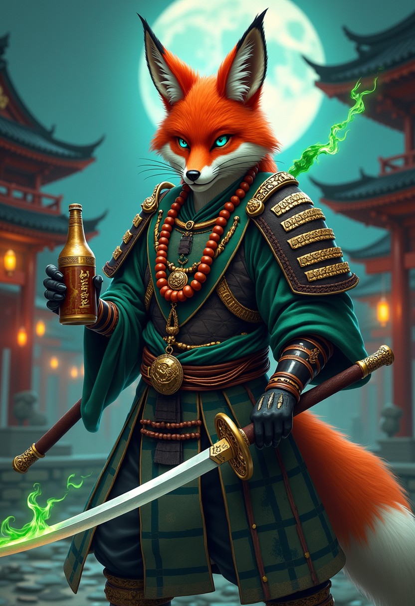 dark Elden ring style art, anthro red fox samurai monk, blue eyes, drunk facial expression, carrying saké bottle in one hand, trickster illusion magic, dynamic combat pose, wearing ornate fox themed samurai armour with jade detailing, detailed monk hat, carved large wooden bead necklace, carrying large heavy ornate jade samurai sword with green flames running up it's length, ancient japan setting, shrine, torri gate, bambo, moonlight, chiaroscuro shading, masterpiece