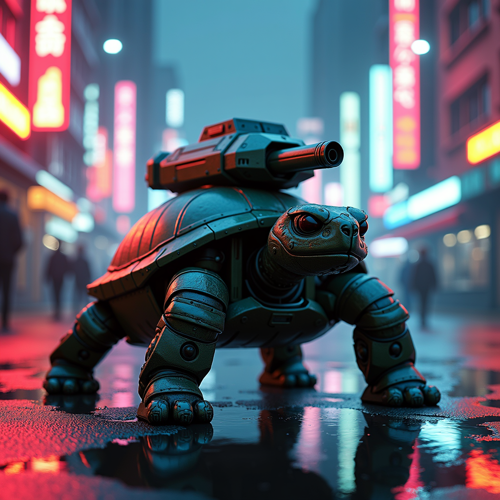 Cinematic still of a robotic turtle mounted with a tank turret in a cyberpunk metropolis with synthwave glowing neons. The ground is wet with reflections in water puddles. The picture shows sharp details and narrow depth of field.