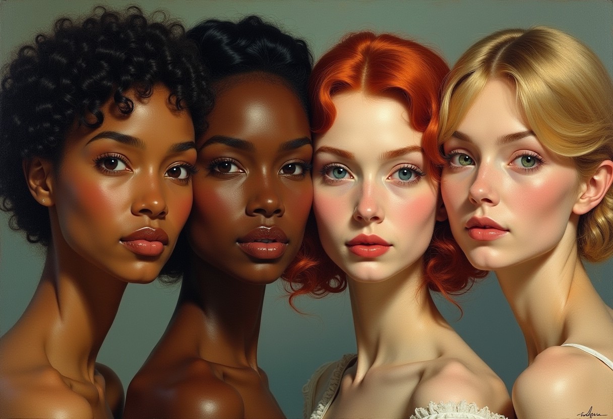 painting of 4 people, black African woman with a asian woman from japan on the left, (asian woman:1.2), blonde woman with blue eyes with a red haired woman with green eyes on the right, (blonde woman with blue eyes, red haired woman with green eyes:1.2), (William Adolphe Bouguereau:0.7), (Norman Rockwell:1.3)