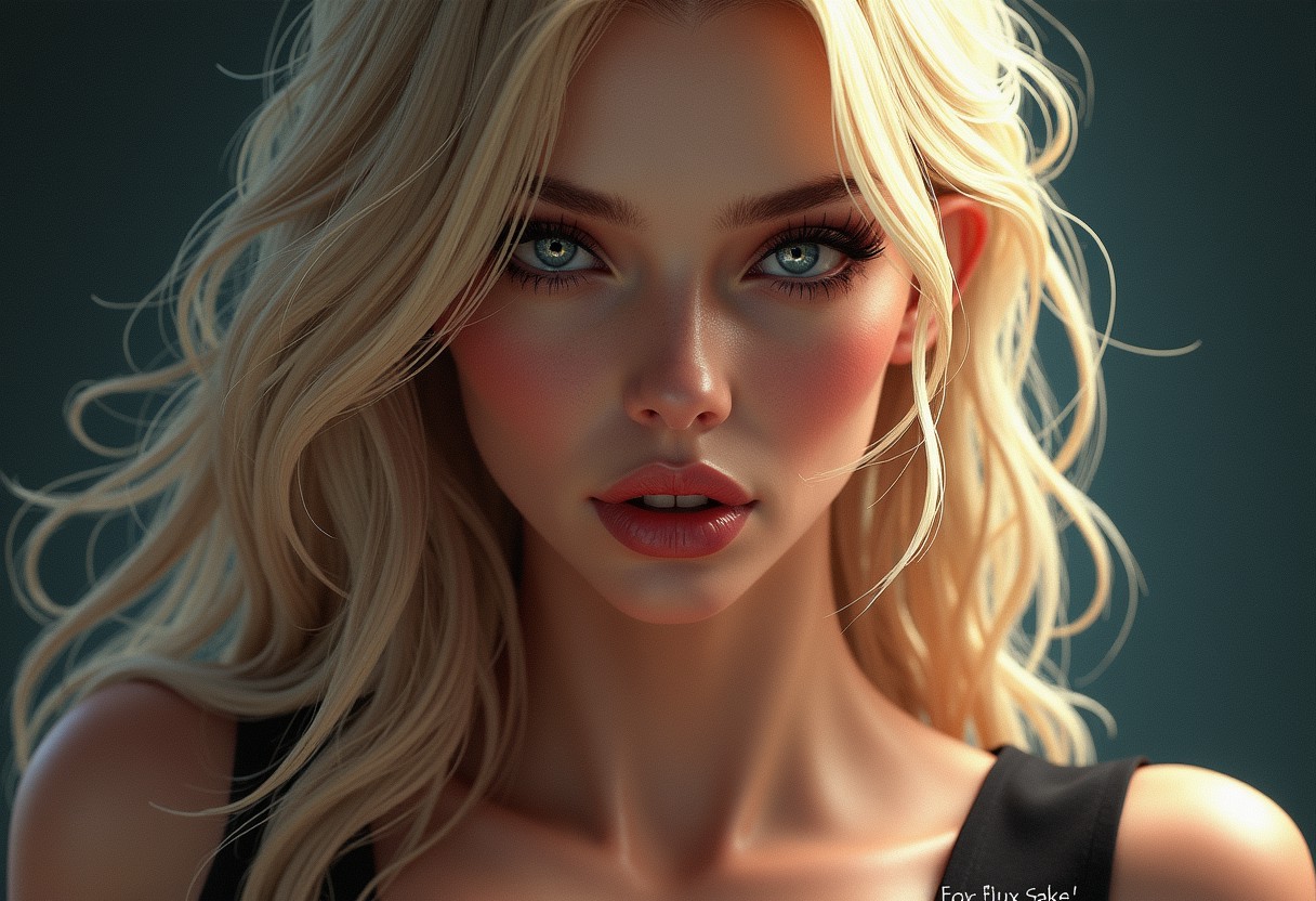 erotic woman, with blonde hair and Luminous eyes looks at the camera, Beautiful picture of the character, character portrait, character portrait, epic portrait illustration, fantasy concept art portrait, detailed matte fantasy portrait, Detailed beautiful portrait, fantasy art portrait, dark, chiaroscuro, low-key, oil and watercolor painting cleavage, extremely sexy, seductive, long hair, luscious lips, Makeup, Realism clenched teeth, fighting, energy, shockwave, colorful, High quality texture, intricate details, detailed texture, High quality shadow, Cinematic Light, action shot, highly detailed, hdr, vibrant colors, a monologue bubble with Large text "For Flux Sake!"