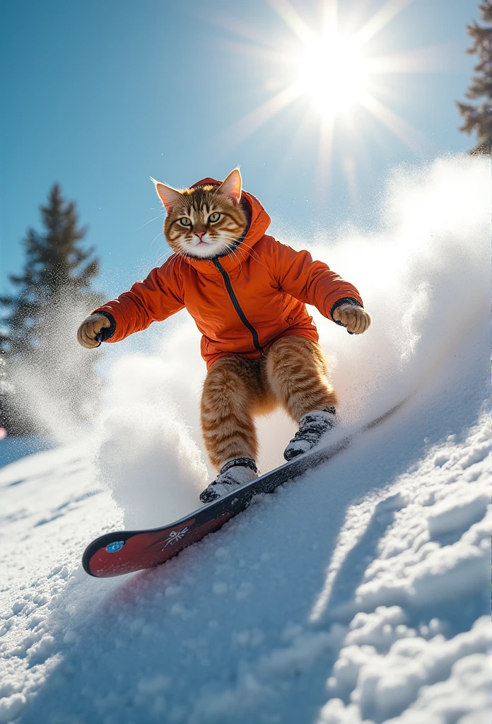ginger cat skiing, snowboard, snow explosion, action shot, nude, sunlight, wide angle, ultra detailed, real life