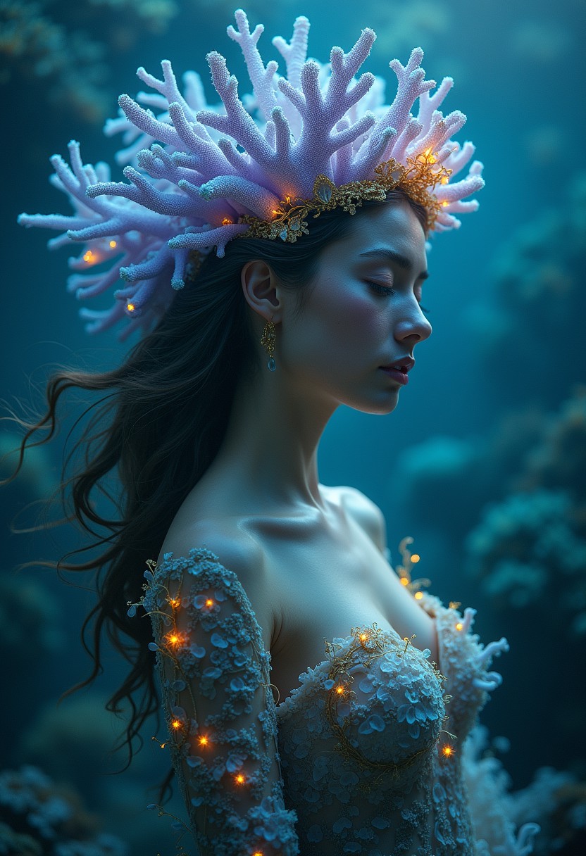 An oceanic oracle rises from the depths of the sea, her form both fluid and ethereal. Her head is adorned with an abstract crown made of coral, intricately shaped and glowing with bioluminescent blues and purples. The coral crown is intertwined with delicate gold ornamentals, shimmering like treasure found in the deep ocean. Her hair flows like water, blending seamlessly into the surrounding waves, and her skin has a soft, iridescent sheen. She wears a gown made of seaweed and shells, with gold accents woven throughout, and delicate sea flowers bloom along her arms, glowing softly in the dim light of the ocean. The scene is mysterious and enchanting, capturing the deep, ancient wisdom of the sea, similar to the underwater fantasy art of Tomasz Alen Kopera.