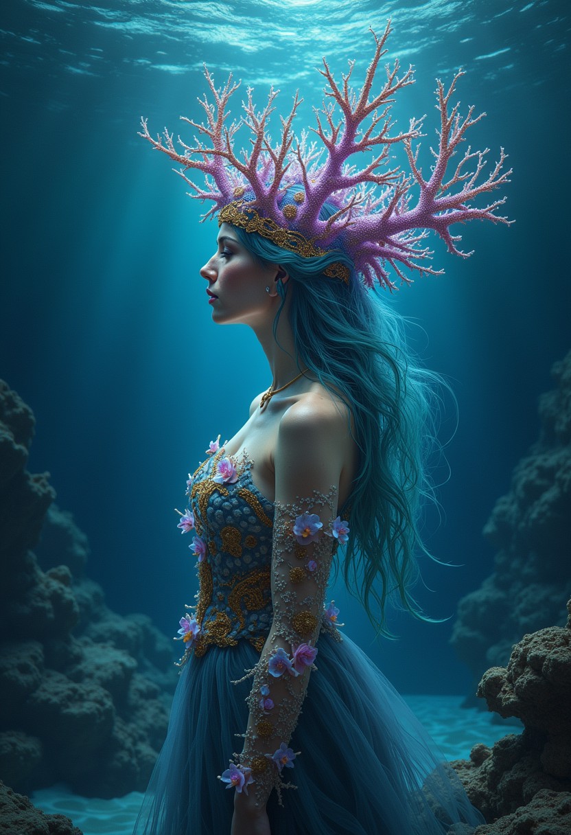 An oceanic oracle rises from the depths of the sea, her form both fluid and ethereal. Her head is adorned with an abstract crown made of coral, intricately shaped and glowing with bioluminescent blues and purples. The coral crown is intertwined with delicate gold ornamentals, shimmering like treasure found in the deep ocean. Her hair flows like water, blending seamlessly into the surrounding waves, and her skin has a soft, iridescent sheen. She wears a gown made of seaweed and shells, with gold accents woven throughout, and delicate sea flowers bloom along her arms, glowing softly in the dim light of the ocean. The scene is mysterious and enchanting, capturing the deep, ancient wisdom of the sea, similar to the underwater fantasy art of Tomasz Alen Kopera.