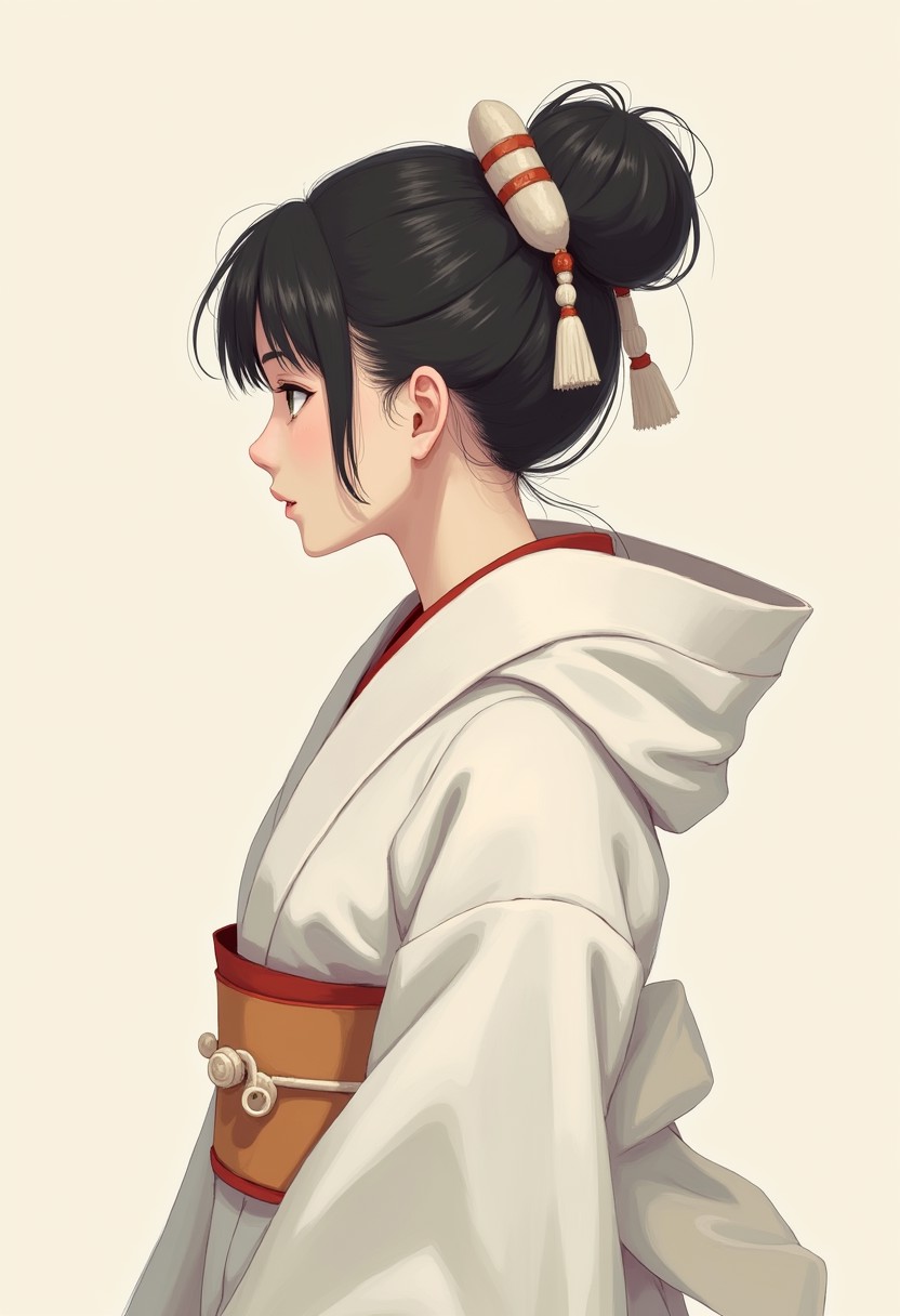 A digital painting in the aesthetic of contemporary Japanese art, using a soft color palette. A side-profile view of a minimalistic female figure donning traditional Japanese garments and accessories. The artwork showcases geometric patterns and a thoughtful expression on the character's face.