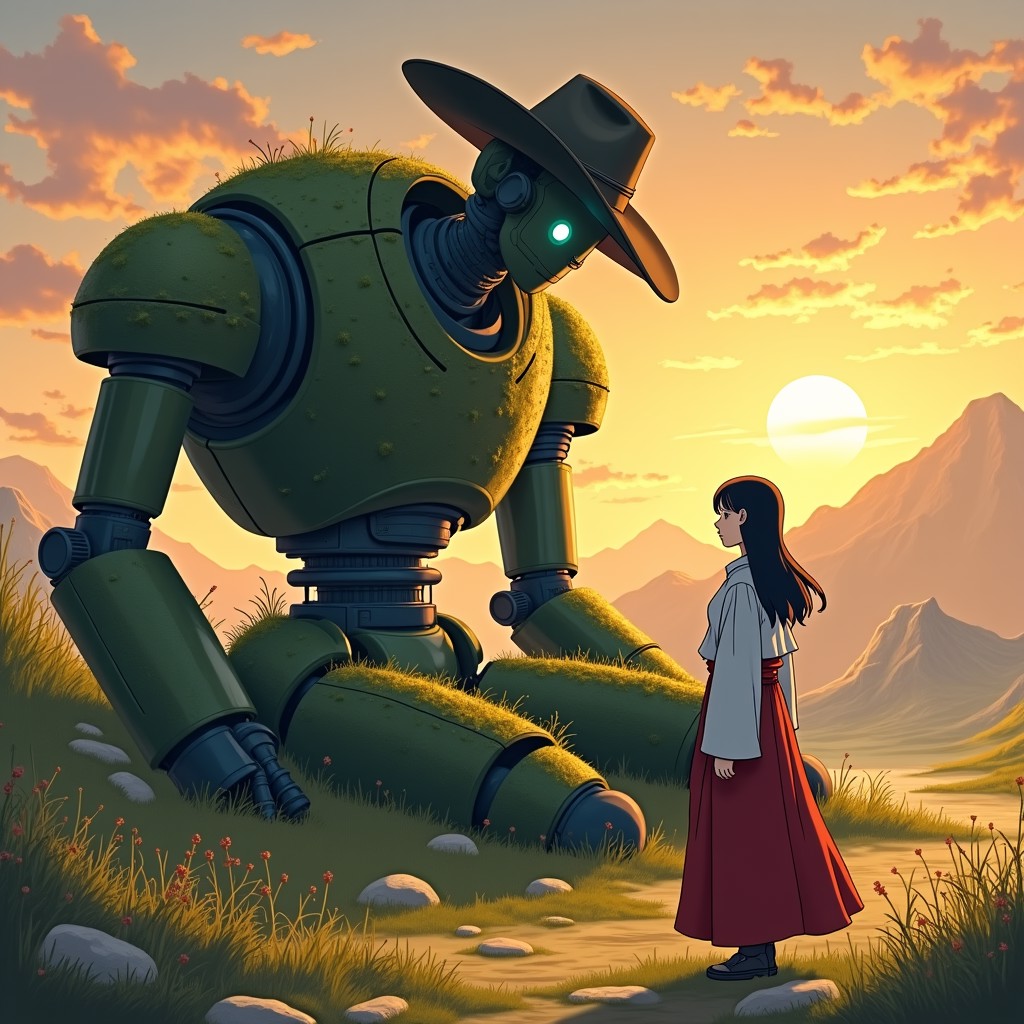 A giant robot cowboy sits collapsed in a valley, moss-covered robot. The robot's eyes are dim. The robot wears a cowboy hat. A beautiful woman in traditional priestess robes stands in the foreground, thoughtful. mountains in background. sunset sky. In the style of anime.