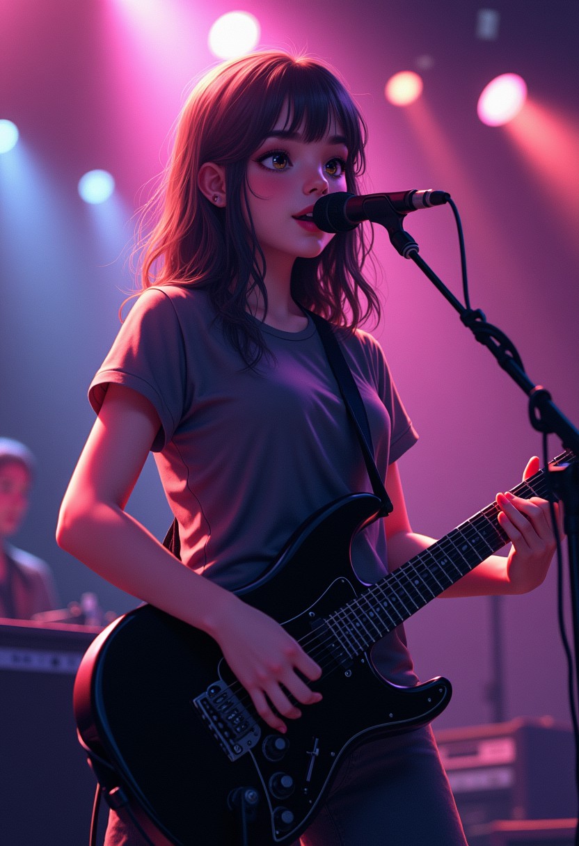 detailed reflecting eyes by professional digital painting, front lighting, 8k resolution, (girls' band:1.4), (dynamic angle), upper body, black guitar, amplifier, speaker, live stage, smile, Live festival, school, Shining Lighting,