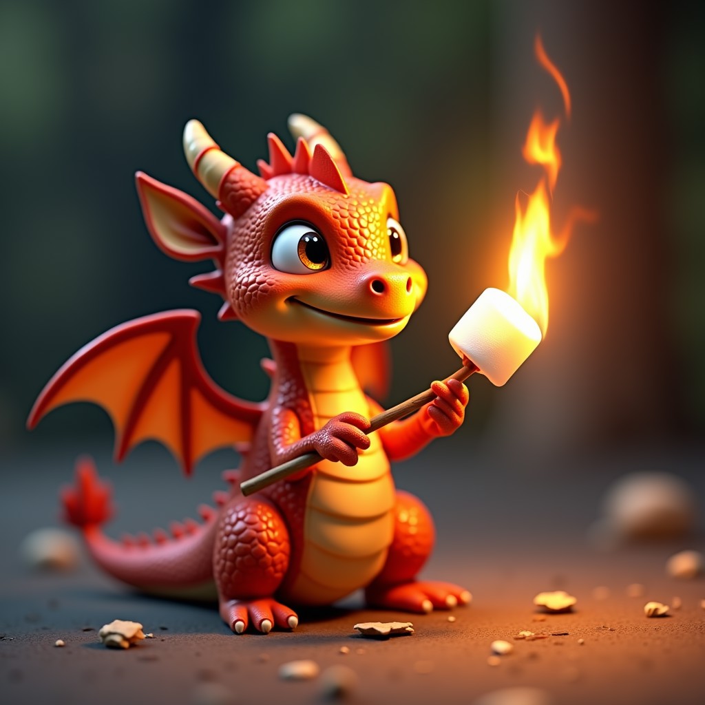 A cute tiny dragon toasting a marshmallow on a stick by breathing fire on it, disney pixar style