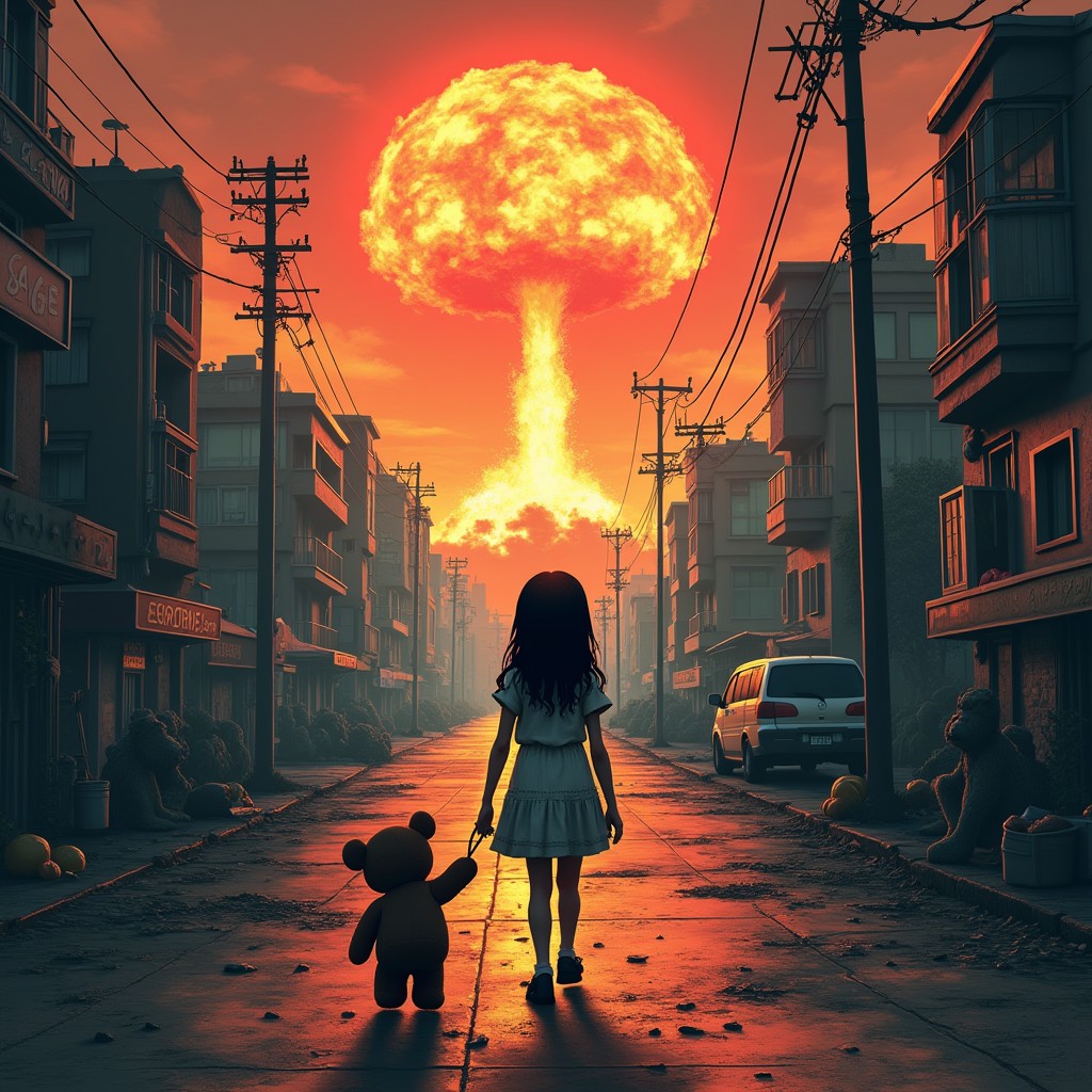 Bold text saying (something went wrong!) Apocalyptic city, cyber city, nuclear bomb in the background, girl walking facing away, girl dragging a teddy bear on the pavement