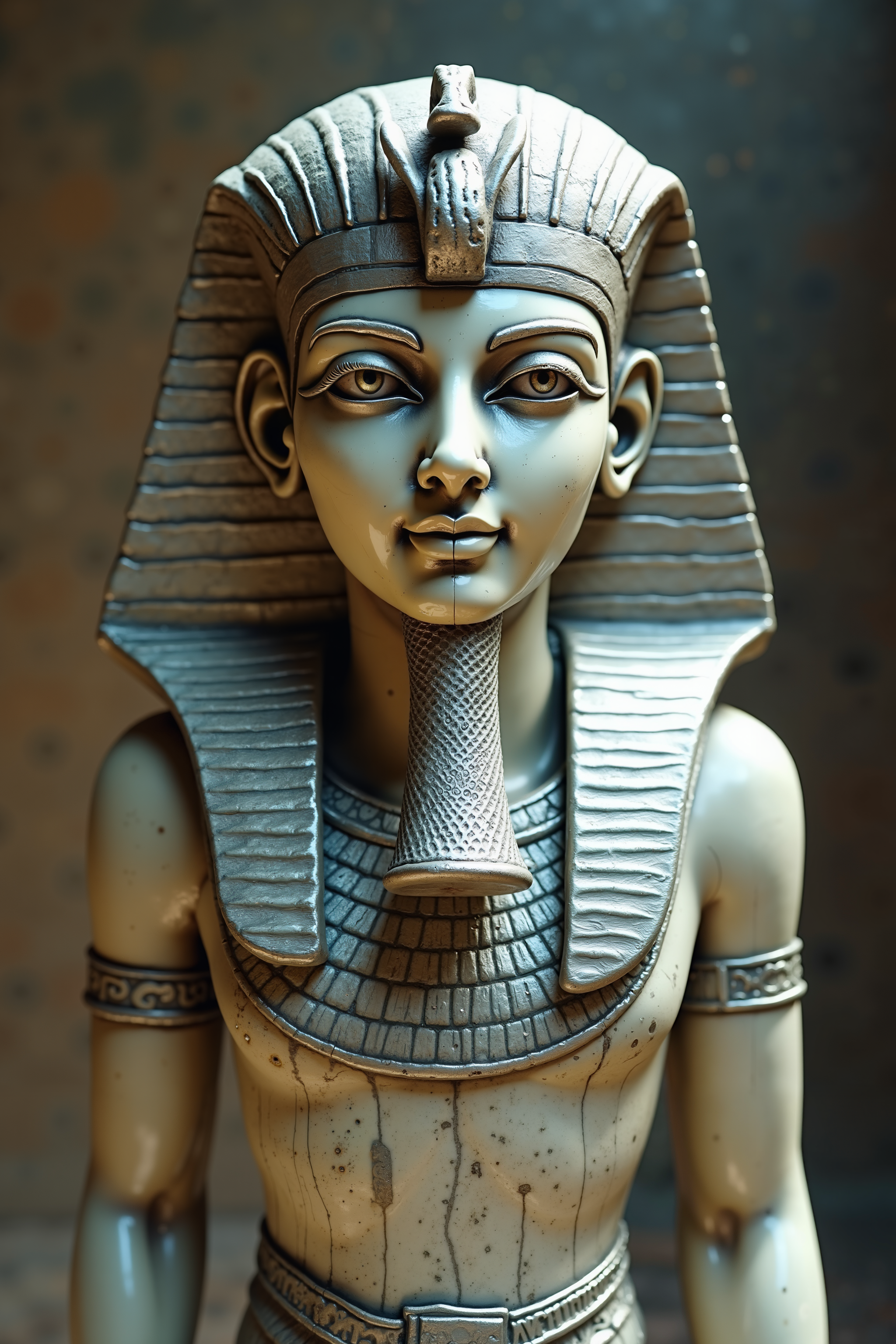 in a dreamlike world, the ancient Egyptian god Alabaster Almadin comes to life. He is depicted in a magnificent and intricate fantasy art style. The stone structure is made of shimmering silver metal,