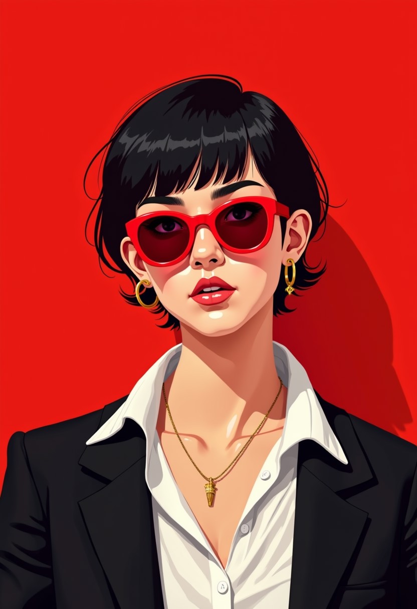 Stylized digital portrait of a person with fair skin and short, dark hair. The subject is wearing red-tinted sunglasses, a white shirt, and a black blazer. They have a confident expression with slightly parted lips and a relaxed posture. The background is a solid, vibrant red, which contrasts with the subject's attire. The person is accessorized with gold jewelry, including a necklace with a pendant and small hoop earrings. The overall composition is bold and striking, with a focus on the subject's face and upper body, sinozick style, flat color, dark theme
